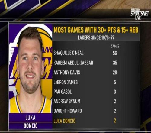 此役,东契奇还创下了纪录。转播方数据显示,这是东契奇的湖人生涯第2次30+15板!追平德怀特霍华德、拜纳姆并列第6,奥尼尔以56次高居第1。